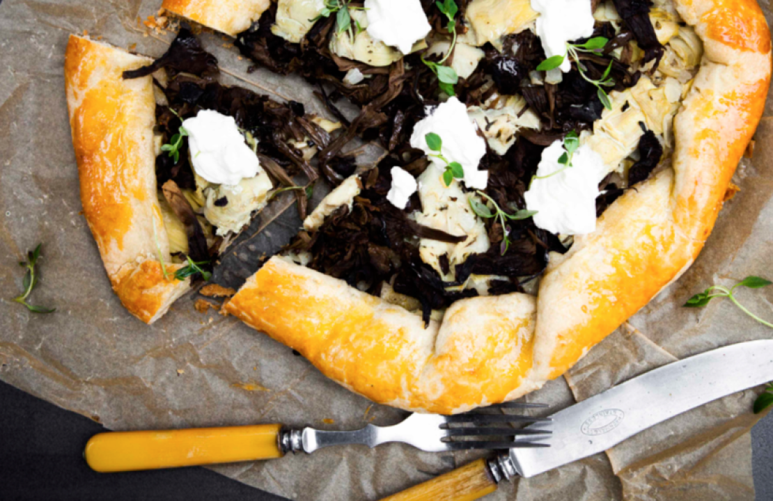 - Spread the artichoke-onion filling evenly on to the base, leave an edge of about 2 cm.